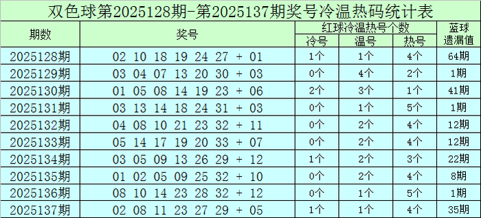 赵千里双色球第2025138期奖号冷温热码统计分析(定义,遗漏0-4期为热码,遗漏5-9期为温码,遗漏10期及以上为冷码)