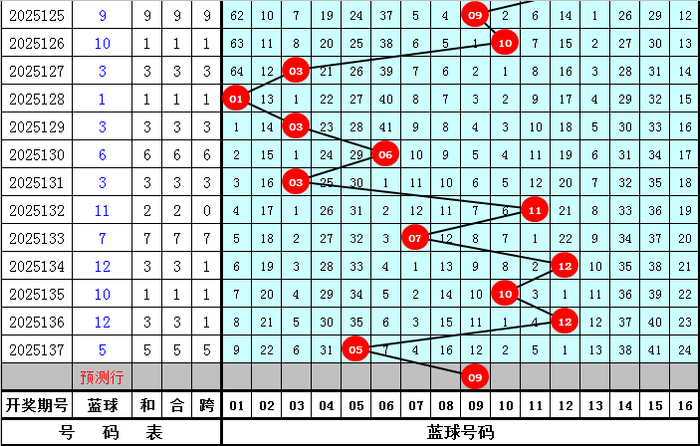 蓝球分析:上期蓝球号码05遗漏为35期,最近10期冷码蓝球解冻4个,温号蓝球回补3个,热号蓝球出现3,目前蓝球冷号有6个:02 04 08 14 15 16,温号蓝球有5个:01 03 06 09 13,热号蓝球有5个:05 07 10 11 12,本期看好温码蓝球回补,关注蓝球号码09。