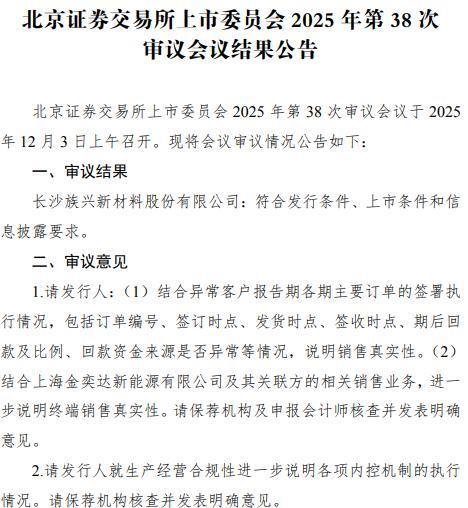 12月3日,北交所披露该所上市委员会2025年第38次审议会议结果公告(以下简称公告),北交所上市委员会2025年第38次审议会议于当日上午召开,会议审议结果为族兴新材符合发行条件、上市条件和信息披露要求。