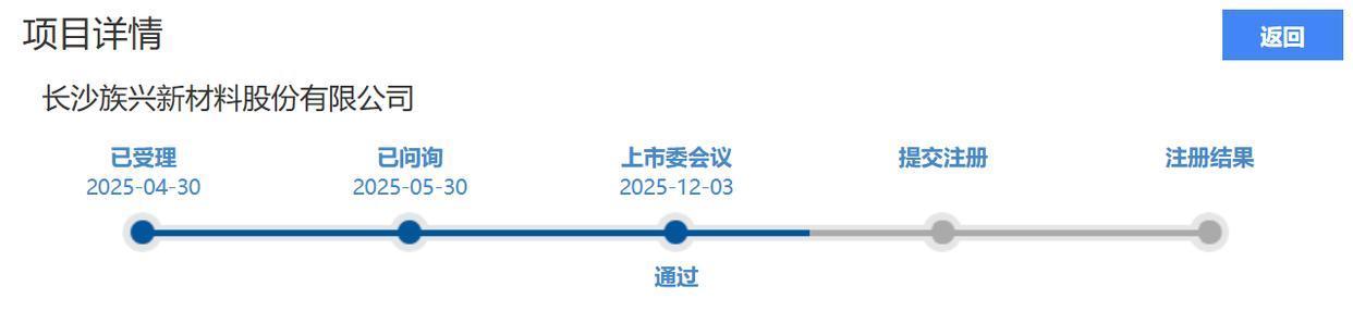 北交所官网最新披露的信息显示,2025年12月3日,长沙族兴新材料股份有限公司(以下简称族兴新材)IPO的状态从已问询变更为通过。