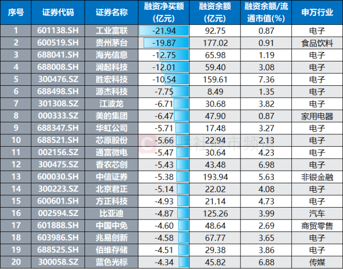 以个股角度统计,在A股融资余额近日六连降期间,工业富联、贵州茅台、海光信息、澜起科技、胜宏科技5股遭融资客重点减持,净卖额规模均超10亿元,同时,源杰科技、江波龙、美的集团等9股融资净卖额也在5亿元以上。从这些个股的行业板块所属上看,电子股占比最高,同时还涵盖食品饮料、家用电器、非银金融、商贸零售、传媒等方向。
