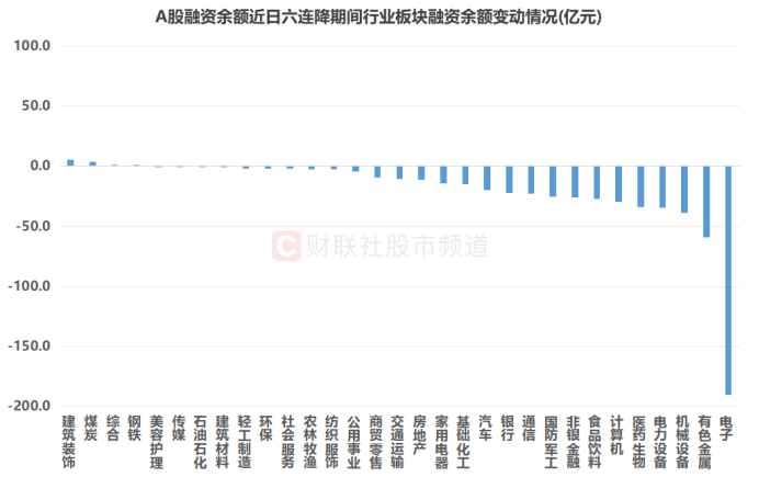 注:A股融资余额近日六连降期间行业板块融资余额变动情况