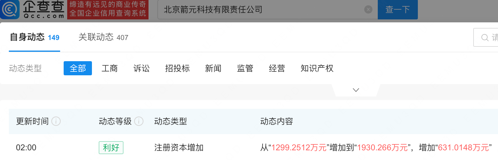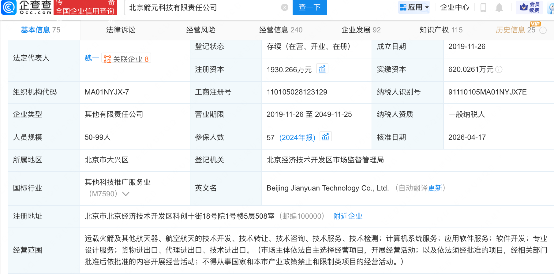 近日,北京箭元科技有限责任公司发生工商变更,注册资本由1299.25万元增至1930.27万元。企查查信息显示,该公司成立于2019年,法定代表人为魏一,经营范围包含:运载火箭及其他航天器、航空航天的技术开发、技术转让、技术咨询、技术服务、技术检测等。