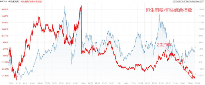 ·先看看港股,下图红线为恒生消费指数/恒生综合指数的走势,代表了消费板块的强度,2000年至今,该指数长期表现较差,特别是2021年以来持续跑输大盘。