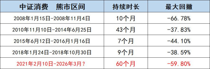 回顾中证消费历次的熊市周期,会发现本轮调整无论是长度还是深度,都远超历史极值。
