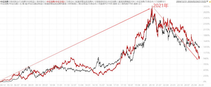 如果把数据拉到更早的2005年,会发现,无论是相对大盘的强度(红线),还是自身的走势,之前的消费行业表现都很不错。