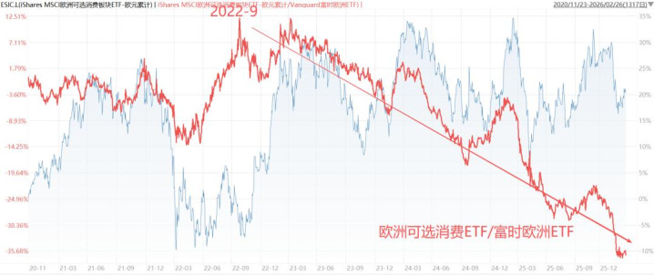 下图红线为欧洲可选消费ETF/富时欧洲ETF,代表了欧洲消费板块的强度,数据只有2020-11至今的,但也能看到,2022年9月以来,趋势开始拐头向下持续至今。