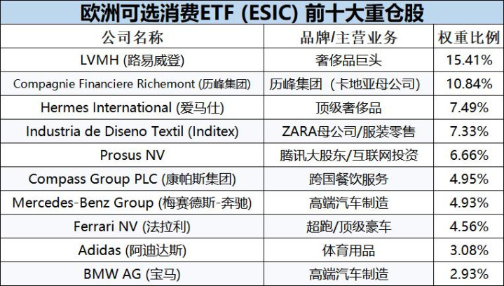 ·欧洲经济近年来虽然萎靡,但欧洲股市有很多历史悠久的知名奢侈品牌。下表为欧洲可选消费ETF的前十大持仓,相信各位老板都买过: