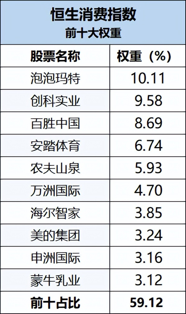 近年来,赴港股上市的消费公司越来越多,指数的代表性逐渐增强。下图为恒生消费的前十大权重股,基本上也都是内地的消费股