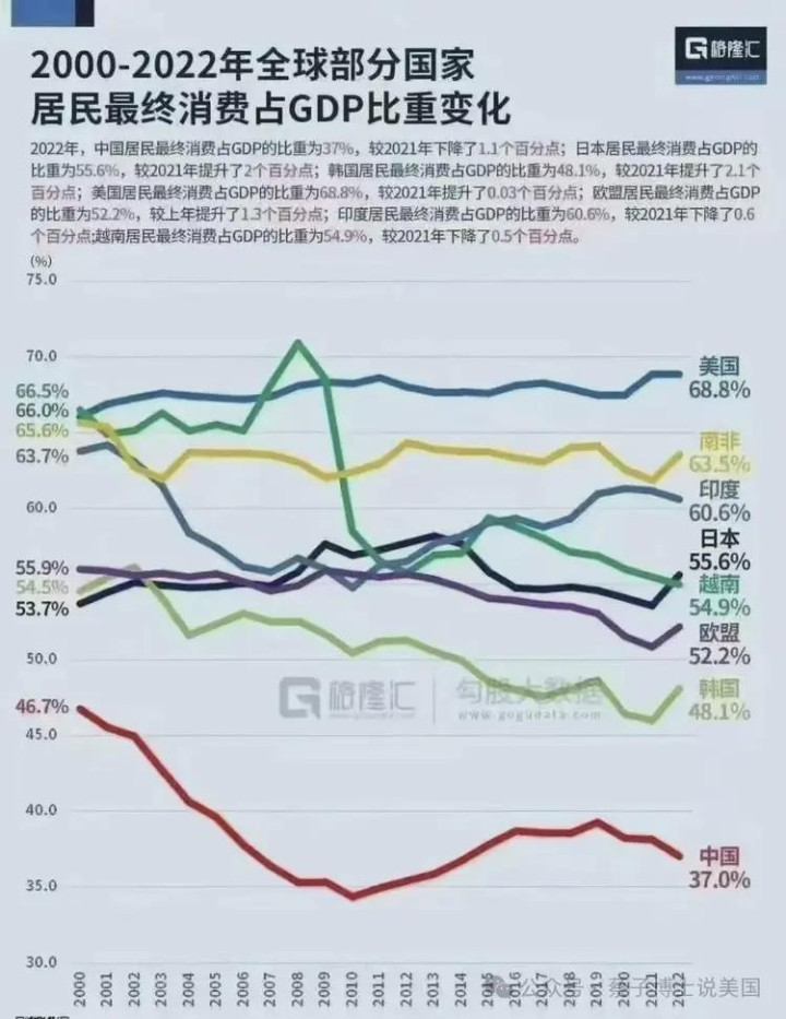而中国居民消费占GDP的比重长期徘徊在40%以下。2024年这一数据仅为36.5%,显著低于全球平均线。
