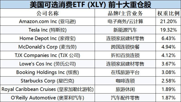 下表为美股可选消费ETF的前十大持仓,也都是大家耳熟能详的全球巨头。